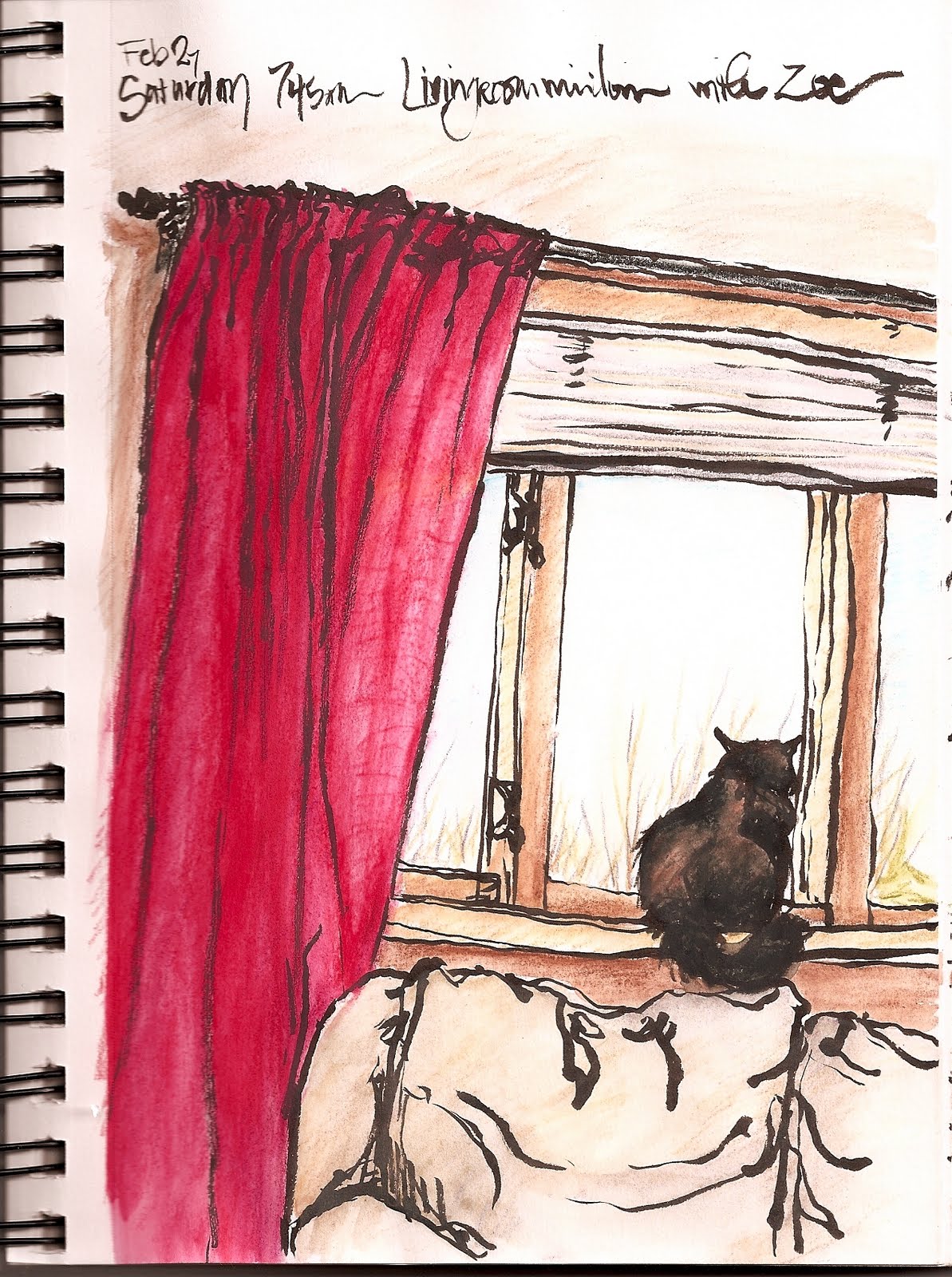 I picked up a Pentel brush tipped ink pen; it has india ink in a cartridge that is refillable and a real paint brush tip. I enjoy drawing with it and look forward to continued experiments. I also picked up my first Niji water brush, mostly to use while out and about sketching, but it was handy to use while curled up in a chair as well. The only tricky thing seems to be filling it with water. In order to use the water brush I broke out the Derwent watercolor pencils – always fun. All in all it was a good morning sketching!