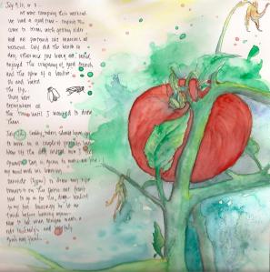 I am trying to make an effort to draw/paint/art everyday this summer, with mixed results. I was supposed to begin my book illustrations today, but I was feeling a little “off”, so instead I journaled my tomato excitement. This is my page from today. I sat out front on my step and drew the first, ripe tomato on the plant. Being I was at home and had the luxury of time, I first sketched in sharpie pen and then came in and grabbed my paints and brush and did some watercolor over the pen drawing. I spent about an hour total on this page.