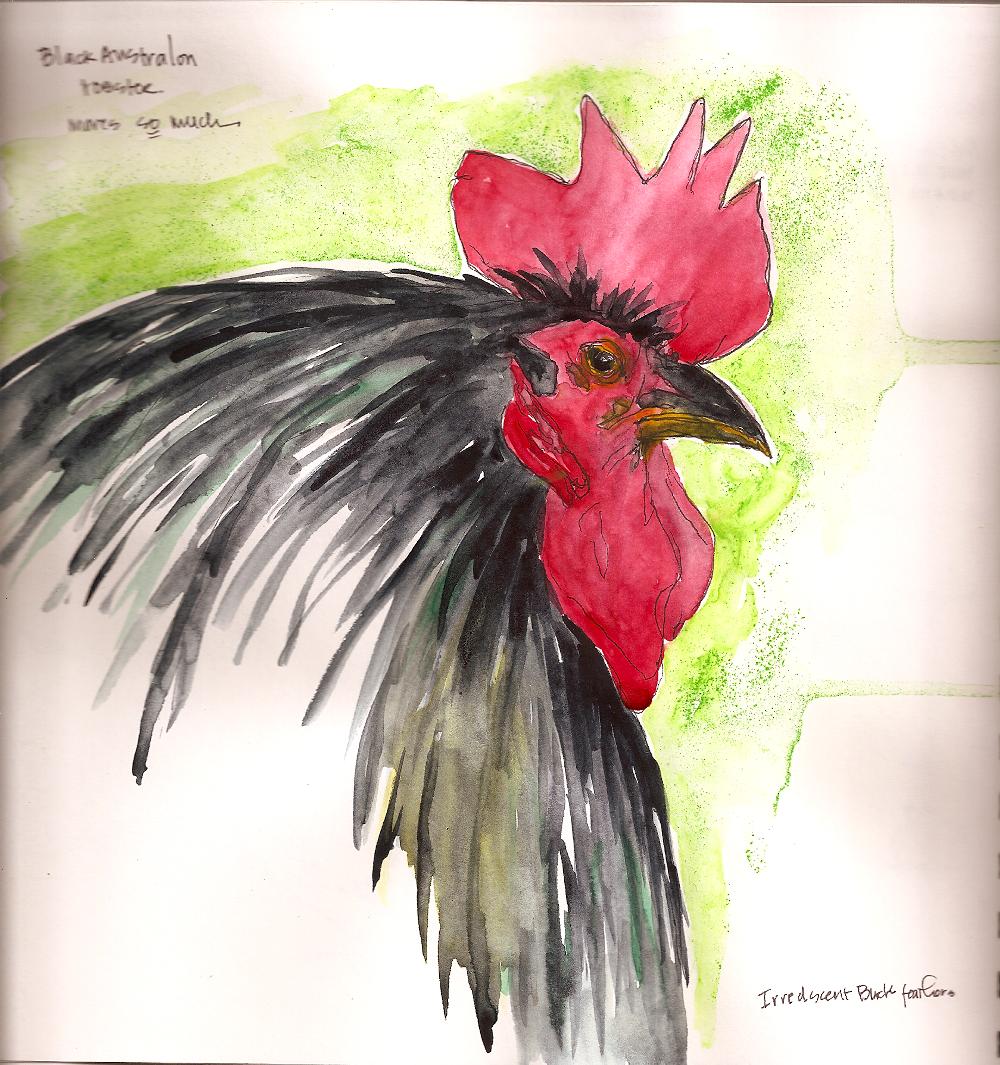 I know, I know, I have already talked about this sketching trip to the state fair, but I still have a couple of great sketches to show. One of a chicken, a rooster really, that started at the fair as a pen sketch like the rest of my work from that day and got altered later that evening at home by some paint.