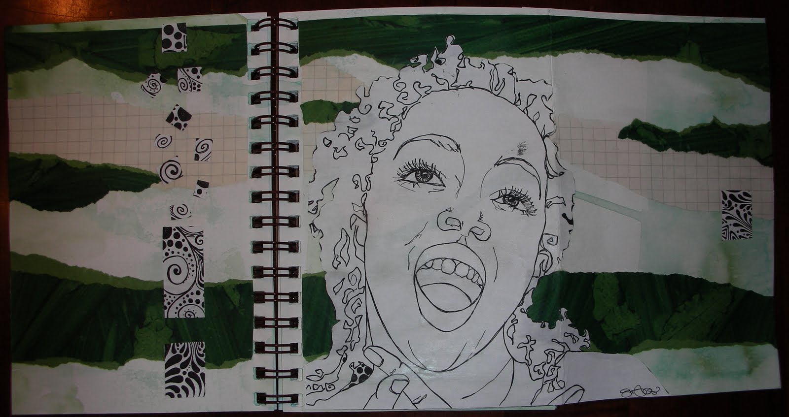 The face drawing on the inside of the foldout is the subject matter of the drawing I copied and cut apart for the background designs. It just happened to fit well on the page, so I went with it. The image below is my first completed recycled art collage for the visual journal workshop. I think we are going to continue to work with the collage we create this week, so I intend to make at least one, hopefully two, more to work with, especially since this feels done to me now.