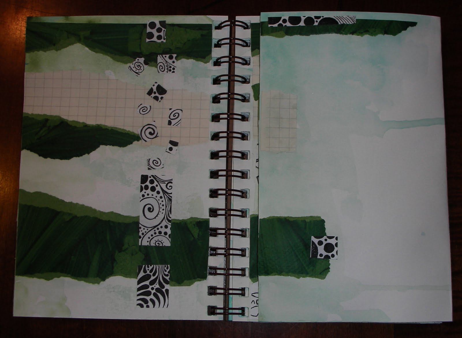 Working on a page spread that was prepainted with liquid acrylics and that had a foldout on the right hand side, I added some graph paper and paste paper scraps that I ripped and glued down with matte medium. I then used the background from a photocopied drawing that was an example from my drawing class. The background from the drawing was a solid mass of doodles and line pattern, so I cut it up into small rectangles and squares to glue down. I glued a few elements on the closed page too, even though it will be the next page and I will probably draw something different there, I felt like it should flow when the flap was shut.