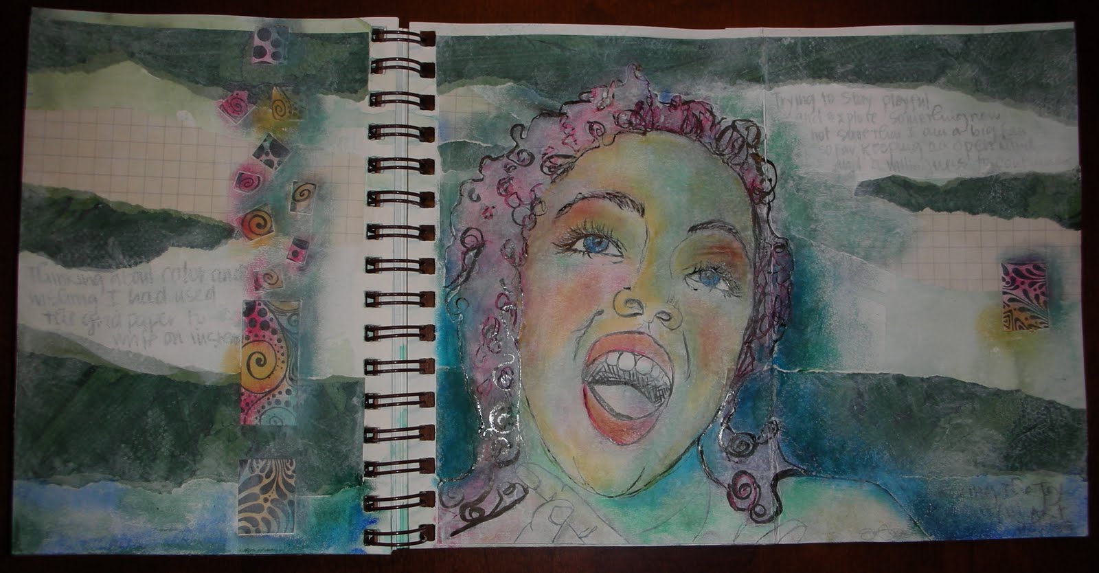 So this week’s task was to add under journaling in pencil, depth with charcoal, then add new color with oil pastel, all of which got blended into the page with a gesso wash.