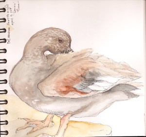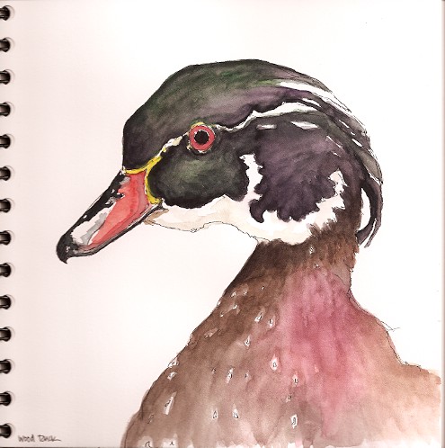 The wood duck above was my second sketch of the night. I am working in a 7×7 Stonehenge wired sketchbook. I sketched first in sharpie pen and then worked in watercolor to try and capture the great color and iridescence on this duck’s face.
