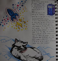 Over the course of filling this journal I used: pen (usually Sharpie pen but occasionally a micron or brush pen), markers, watercolor, acrylic, collage (with gluestick, PVA, and gel medium), colored pencil, watercolor pencil, and