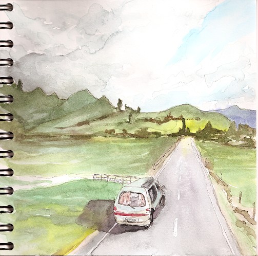 The June Virtual Paintout location was New Zealand. I had to get in this month! Finished in my current skecthbook on the last day. Sketch done in a Stonehenge journal with a PITT pen (size S/brown) and Grumbacher artist watercolors.