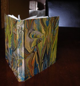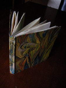 I made this simple journal (about 7×7) by using up some recycling I had laying around in my studio and a few sheets of Rives light in cream that I wanted to try out for journaling. For the recycled bits I used some cardboard packing material from some books that I ordered and the brown kraft paper that was around my paper purchase from a local art supply store. The brown paper was then marbled to give it a decorative feel. It is bound together using a basic pamphlet stitch with three signatures that were stitched through the spine, leaving the stitches exposed on the outside.