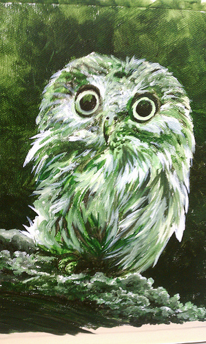 This little green owl came about as we are beginning our first actual painting using a monochromatic color scheme. This began as a demonstration for transferring an image and beginning to assign colored values to a painting from a black and white reference image and I just had to complete the entire thing this afternoon because it was just too much fun to paint. I may just have to do another acrylic painting, something I rarely do, just to have more fun with painting in a “new” medium.