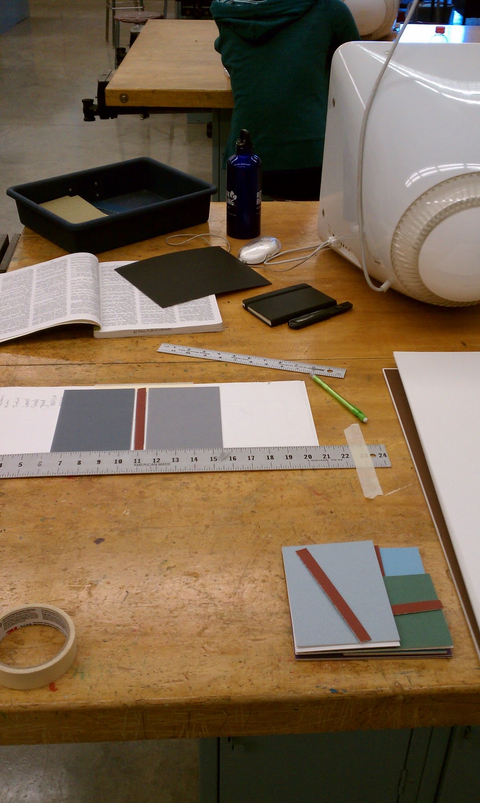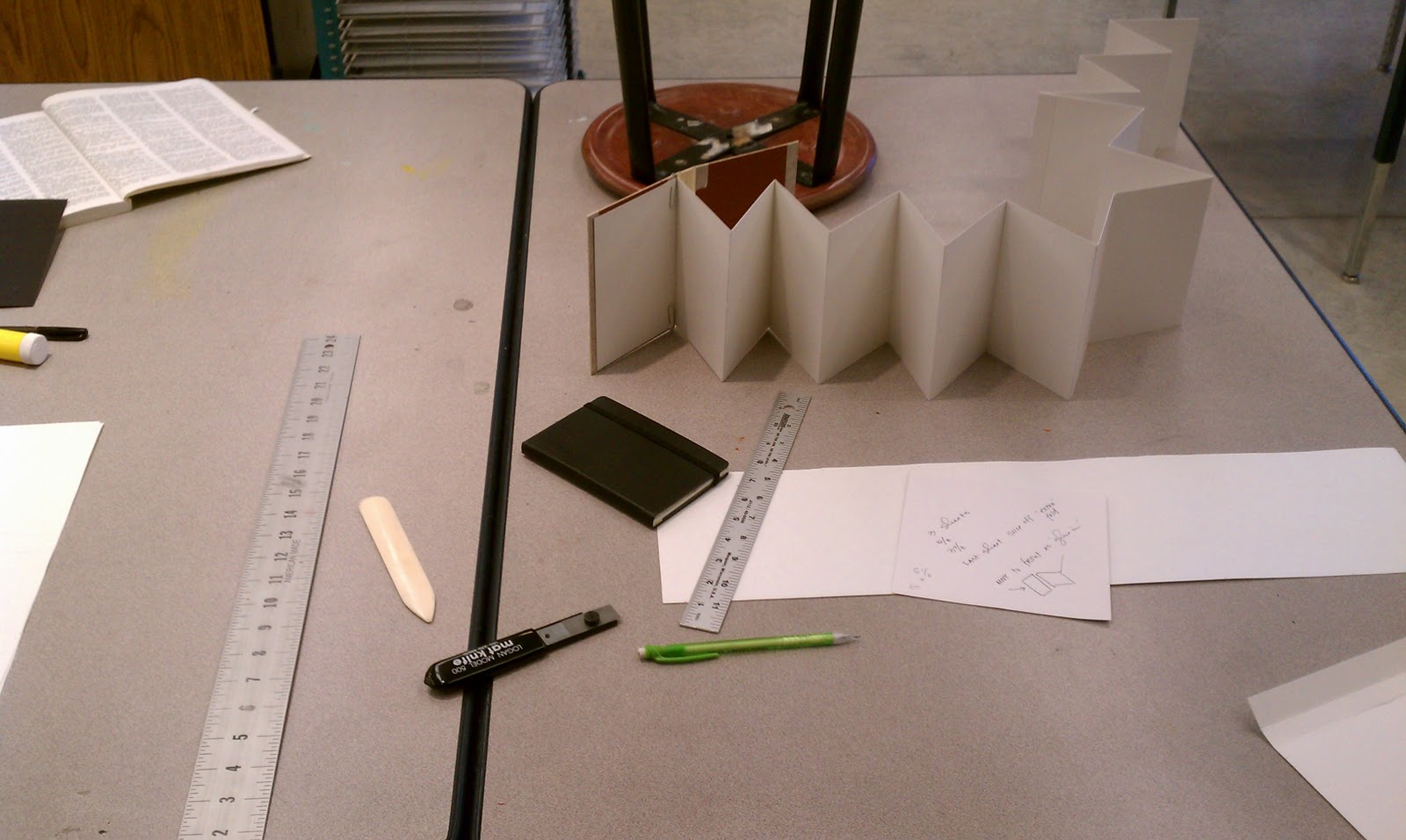 | Beginning of the planning and mock-up process. Good notes and lots of measuring all lead to a smooth book binding project. |