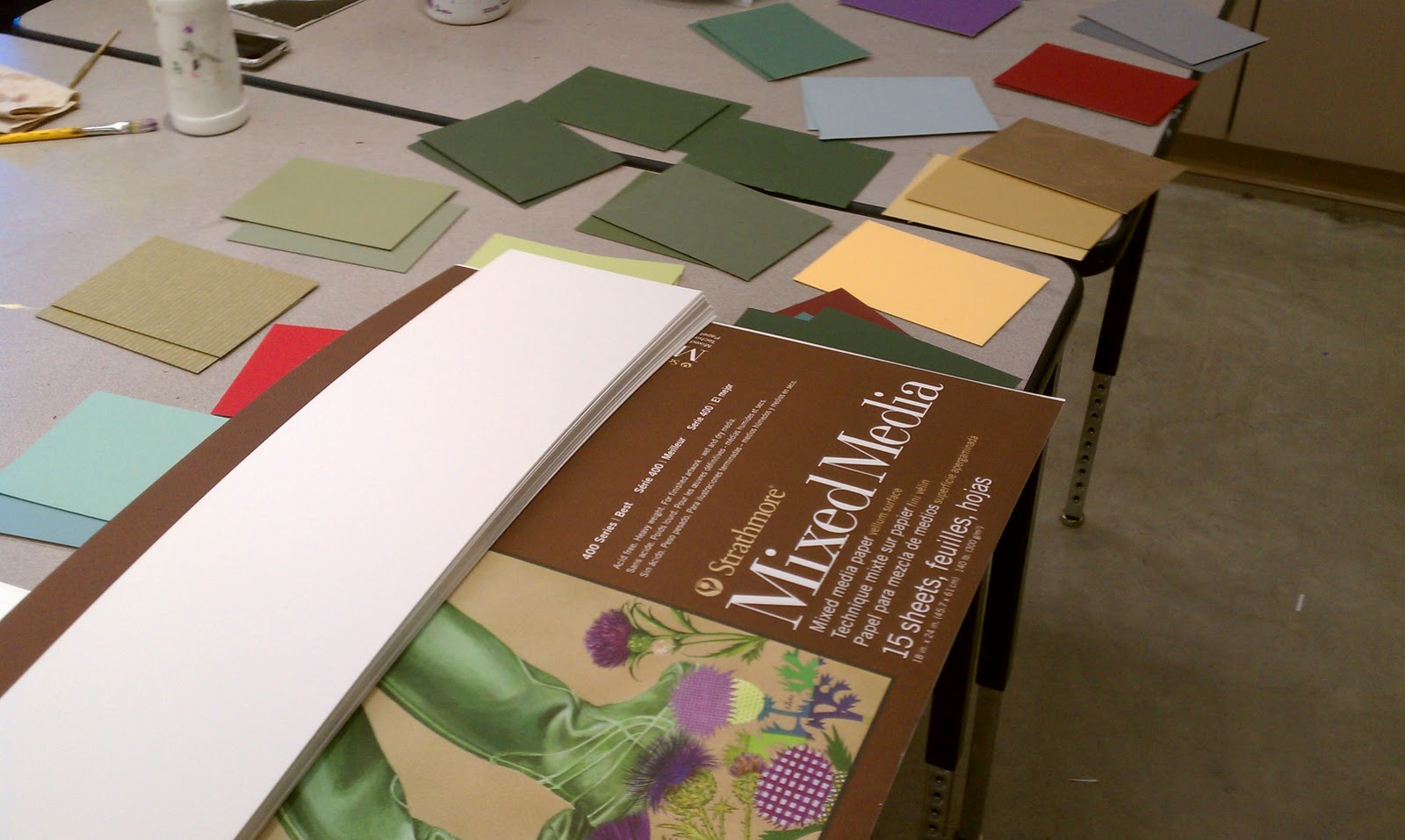 As I was making my mock-up I was also trying to decide which paper best suited the needs of my students and my budget. I decided on the Mixed Media paper (400 series) being made by Strathmore. I had some of the large pads (18×24) on hand in my classroom already, and my students were loving it for all sorts of work they were doing. It is also reasonably priced, so using an entire pad of it to make twelve books was not cost prohibitive, especially since I was planning on using recycled (matt scraps for cover boards) and on hand (my own marbled paper, tape, glue etc) materials for the rest of the project. It also seemed like a good paper choice to hold up to the accordion structure itself, being it is heavier paper and wouldn’t sag or tear at the folds with repeated folding and unfolding.