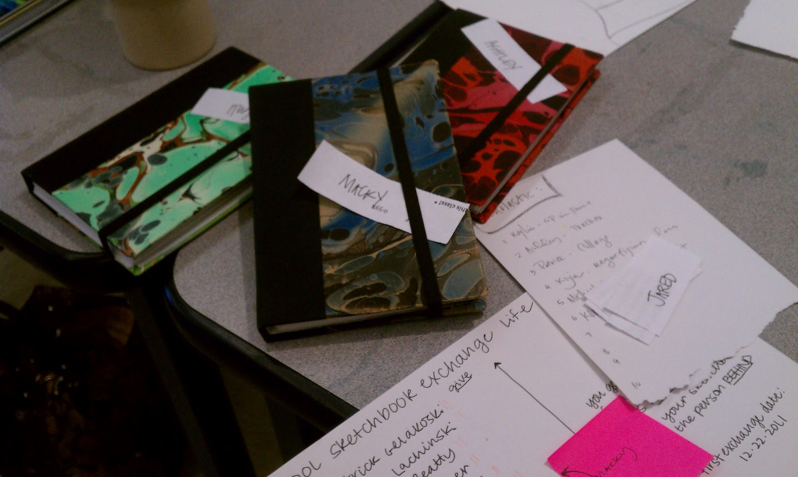 | Three of the completed books, awaiting delivery to the next student in the exchange. |