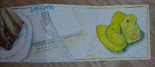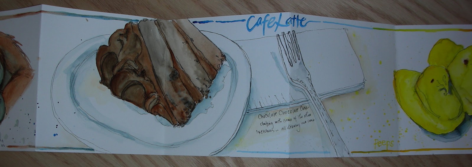 After a brief meeting of many of the sketchers that were at the zoo that day and a discussion about paper and supplies and comparison of pages completed. Some of us went to a nearby cafe to enjoy some cake in honor of the anniversary and to continue to enjoy each other’s company and sketch some more. I had Chocolate Chocolate cake, which was delicious and of course I sketched my piece of cake before I ate it. Once I got home I only had one small section of paper left in this small sketchbook so I saw some peeps on the table and added them in as the last spread, completing this entire journal mostly in one day.
