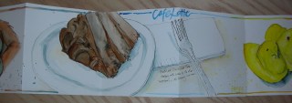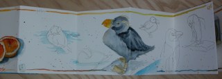 I have only worked previously in this style of journal as an exchange between multiple artists or with my students. This was the first time I had used an accordion as a stand alone sketch journal. I found that I liked working along the accordion and it was particularly nice to work in this small size when going out and sketching at a particular location. The journal itself was made from one single sheet of paper and is roughly 6 inches square when closed. It was also fillable in an afternoon which was great. I left the photos long and so of redundant so you can see the way each image links to the next creating a long story of the day.