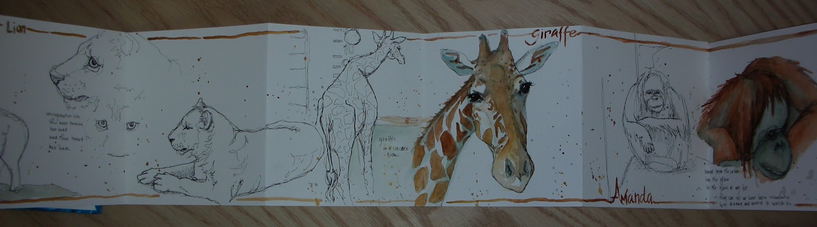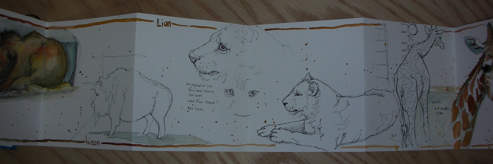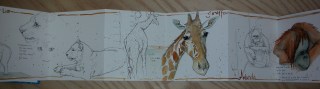 From the lions we moved to the giraffes and I have to say they are strange to sketch because they are such strange animals when you really get to looking at them. They are huge and have unusual proportions with the long thin neck and legs but overly large cow type body that is hard to capture on the page. I did the pen sketch of the entire giraffe at the zoo and added the up close face with watercolor from a photo taken at the zoo after I got home.