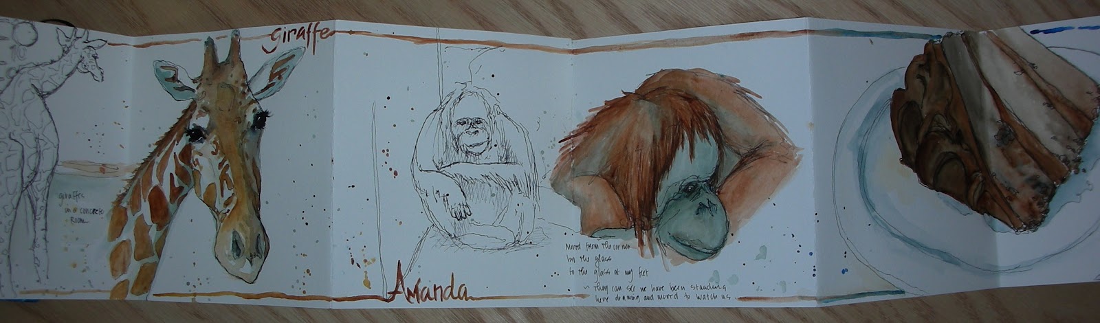 Our last sketching stop was to the ape house which was very crowded and busy. The apes and monkeys seemed to be enjoying the attention and were busy looking at the crowds looking at them. We found a relatively clear spot to sketch the orangutan who was down the glass from where we stood and sketched. She seemed to know that we were watching her differently than the other zoo visitors and after a few minutes she came to where we stood at the glass and sat at our feet. I got down a quick outline of this closer view before having too many children launched in front of me and then I stepped back to paint my sketch. After finishing our drawings it was time go meet the rest of the sketchers. Roz had found out that the orangutan’s name is Amanda and that she paints, so before leaving we all showed her our work at the glass where she sat. She looked from one page to the next and signed something to us. Of course not one of us knows sign language so we do not know what she said but we do know that she seemed to understand that we had made drawings and she acknowledged our work. Whether or not she recognized herself is hard to say.