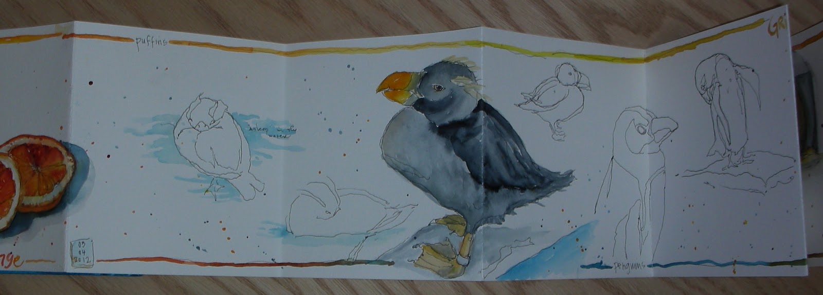 One additional thing I did as I finished the peeps was to add an outlined edge to the entire journal along with some splashes of color from my paints that went along with the edge and with the sketch on the page. I got this idea from the first video lesson at the Strathmore Online Workshop on watercolor sketching with artist Cathy Johnson. I like the effect that the edging and splatter gave the book as a whole, it really helps tie together all the different sketches and unifies the long format as one finished piece of work.