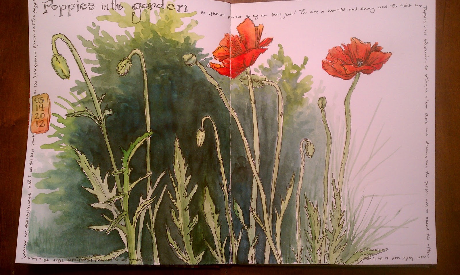 I came home from work yesterday and my first two poppies had bloomed and were just screaming to be painted so I grabbed my big book, my paints, and a chair and spent a couple of hours out in the yard sketching the poppies