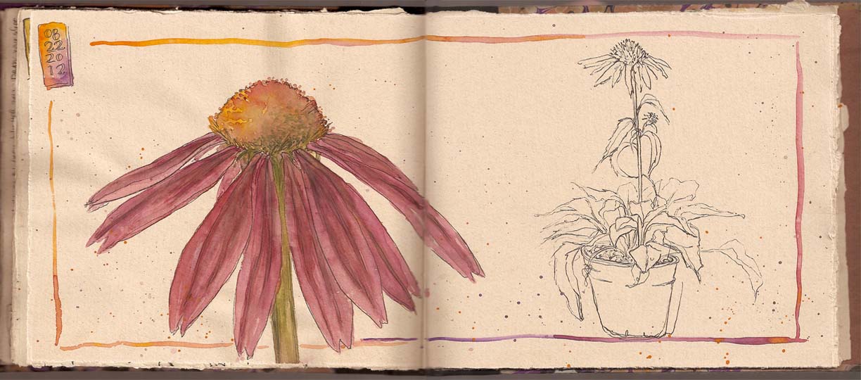 A page from my current journal drawn on my front patio from a potted cone flower plant that is patiently waiting to be planted in my garden.Hand made journal using Nideggen paper, Faber Castell Pitt pen size F, Grumbacher watercolors. Full spread 7.5 x 16 or so.