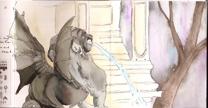 This last June I traveled to France and Italy with a group of students. The trip was crazy busy and had limited time for sketching. I sketched this at St. Michael’s Square in Paris, France while the students in my group had about 45 minutes of free time. It is a section of an accordion fold journal I had with me on the trip.