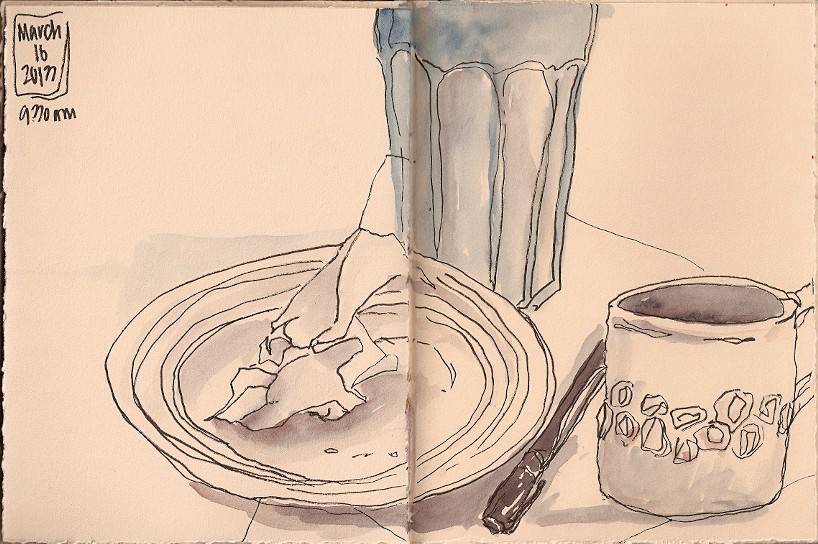 A couple of recent quick sketches from my journal. I have been using the Faber-Castell PITT calligraphy pen to draw a quick contour line drawing and then filling in with a quick wash of Daniel Smith watercolor; each sketch took about fifteen minutes start to finish. My current journal is hand made with fawn colored Stonehenge paper, which I haven’t used in a while and had forgotten how much I like it.
