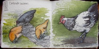 By about two-fifteen most of the sketchers were starting to be hot and restless and Sophie was bringing out some refreshments and the chickens saw this as the perfect time to begin moving through the yard. I guess after seeing us sit quietly in chairs for over two hours they decided we were safe to mingle with after all. From my perch at the back steps I was able to finally sketch a trio of the chickens. I was also able to snap a couple of photos for use as reference later. It was one of those reference photos that I used to finish the part of a sketch that I got of Horatio, the rooster, later that afternoon at home to finish the spread in my journal.