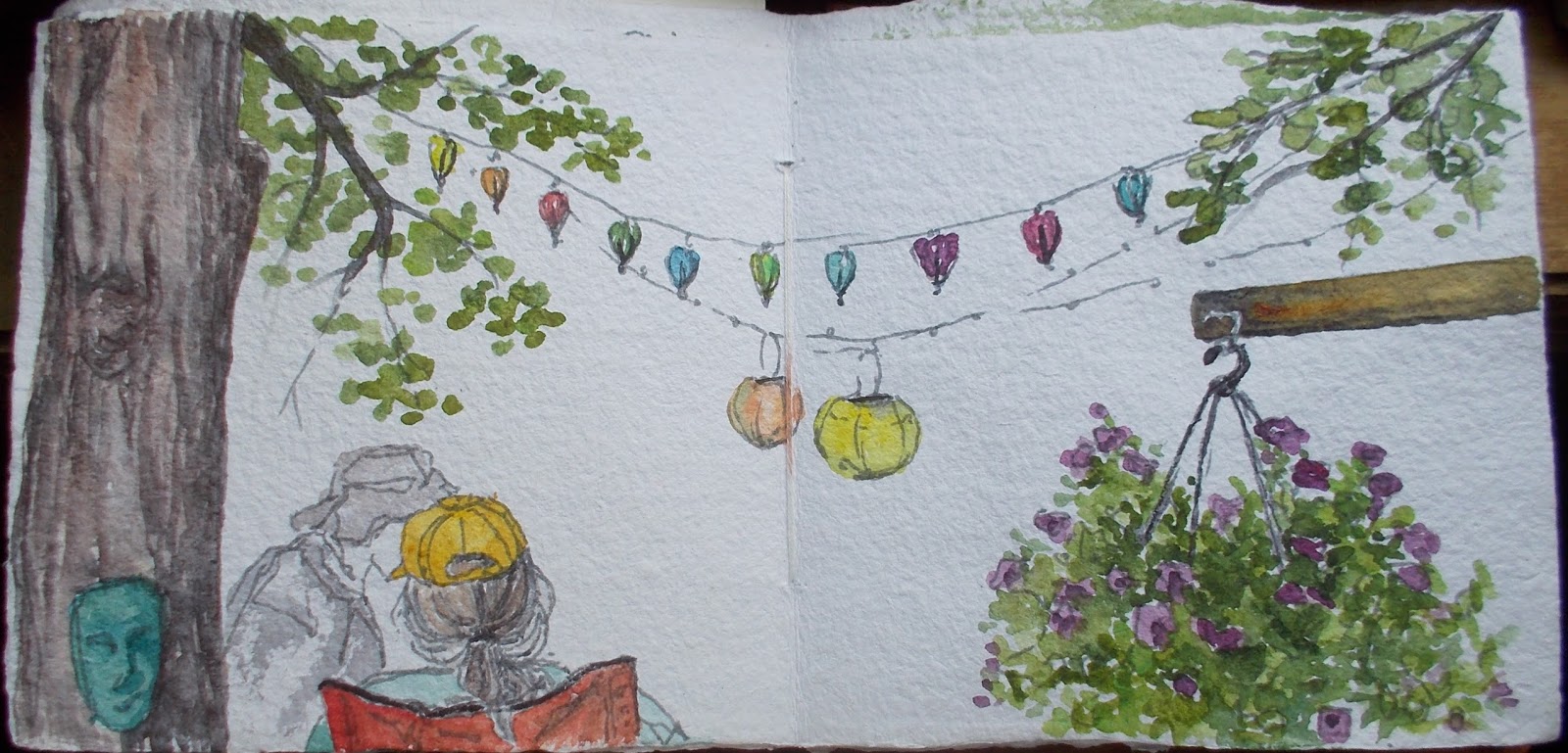 I got to the event about a half hour late, after a few quick chicken gestures and seeing that the chickens were staying put in terms of location, I decided to sit on the back steps and sketch a portion of my view. Chris and Sophie really have a lovely backyard, with hanging baskets, lights, small sculptures, and flower beds. They also had about twenty or so people in lawn chairs quietly sketching, so even not drawing chickens, there was plenty to draw.