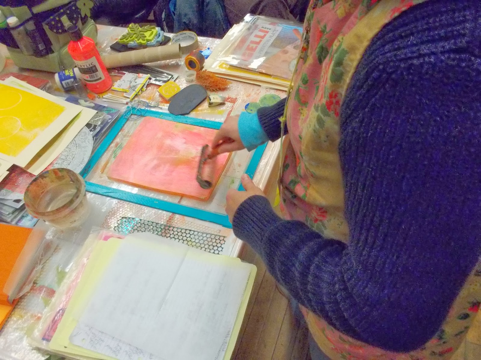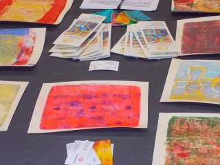 She also showed how easy it was to layer prints on top of each other creating new interesting layered effects. Sheets that have been printed dry fast, and with no need to wipe or clean the late between images, a quick rhythm of making image after image, experimenting as you go becomes apparent.