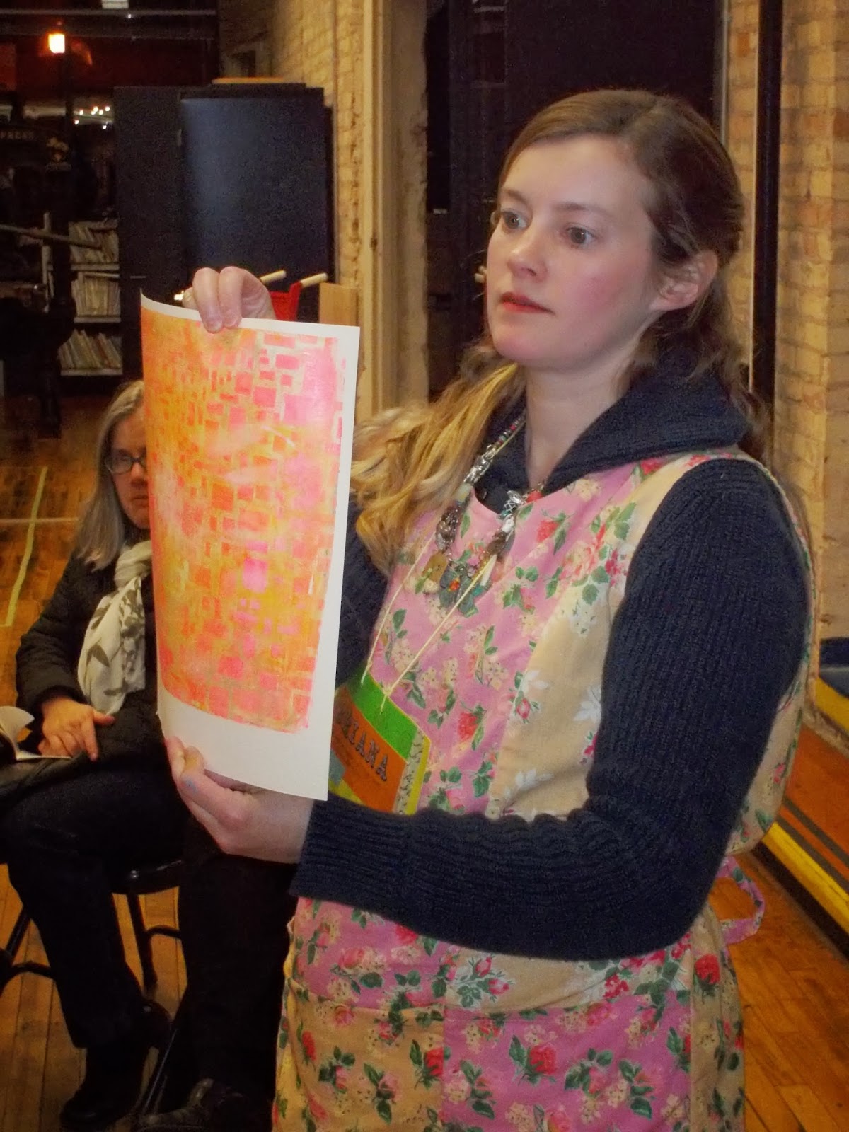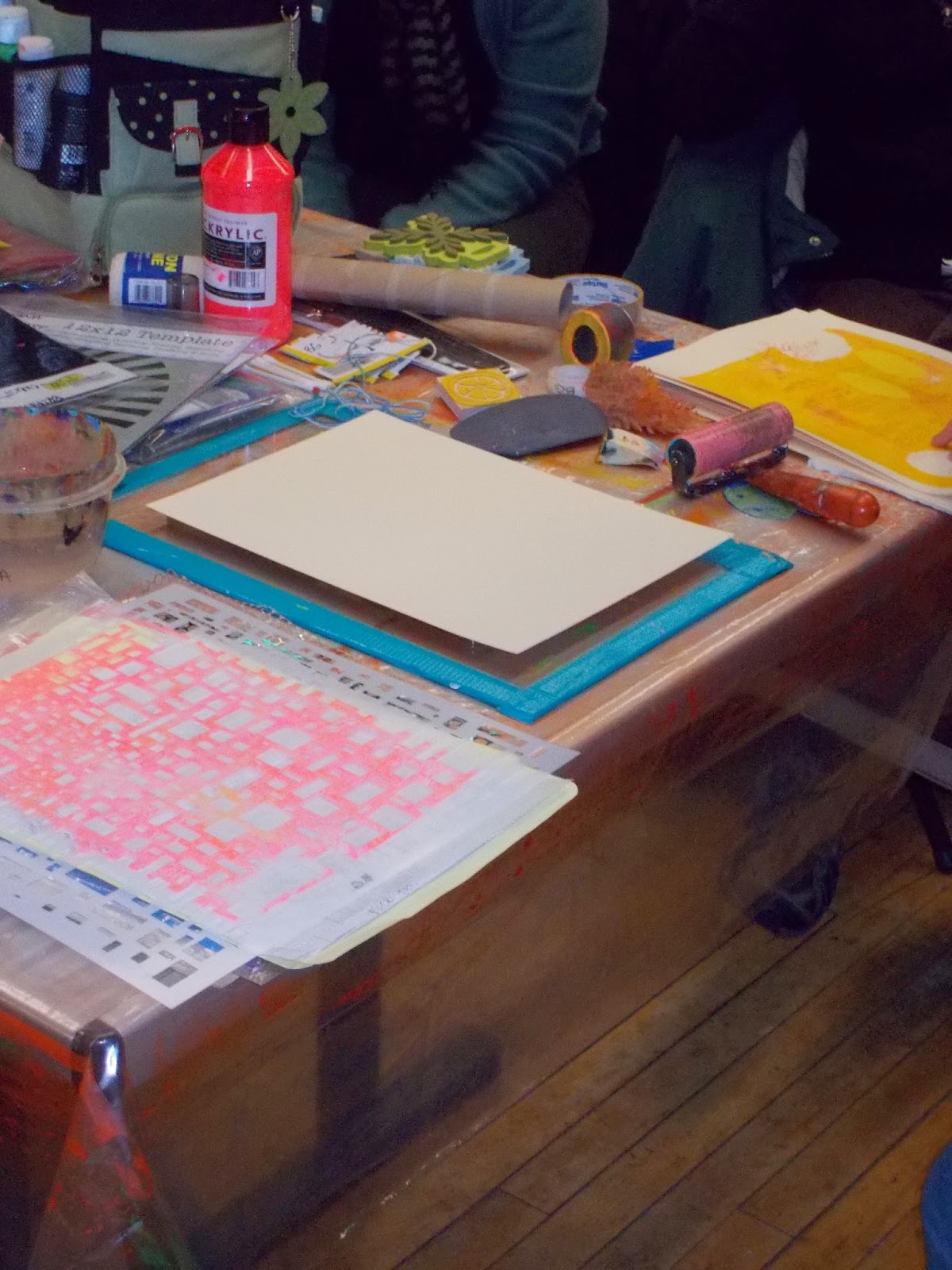 Briana brought along her Gelli plate and set it up right in the flexi space at MCBA. It is small (8×10) and portable, coming in a plastic shell type box that works for storage and transportation. It needs no special set-up, you simply take it out of the case and apply paint. The Gelli plate is really quite magic for making monoprints in the quickest possible fashion using any acrylic paint, texture tools , stencils, or stamps. Results are instant, dry really quickly, and it turns out you don’t even need to wash the plate between prints (bonus).