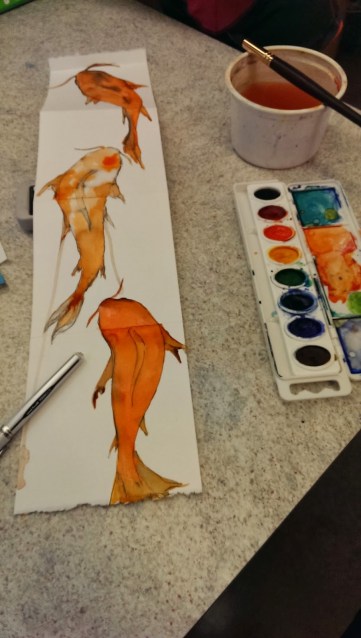 My sixth grade students are working on watercolor koi fish and while they painted today I drew and painted a few more koi myself. In only about ten minutes of course before I had to answer a question and settle a disagreement.