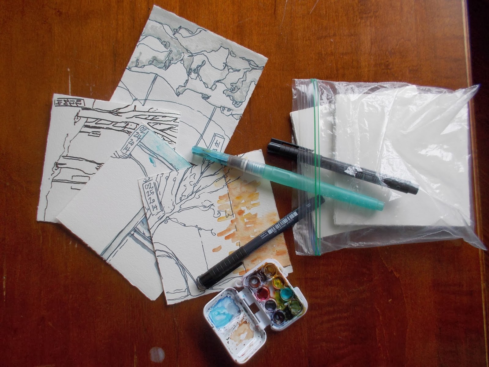 | My car kit – 4.5 inch squares of Fabriano paper, niji brush, Daniel Smith watercolors, Faber-Castell pens brush and calligraphy |