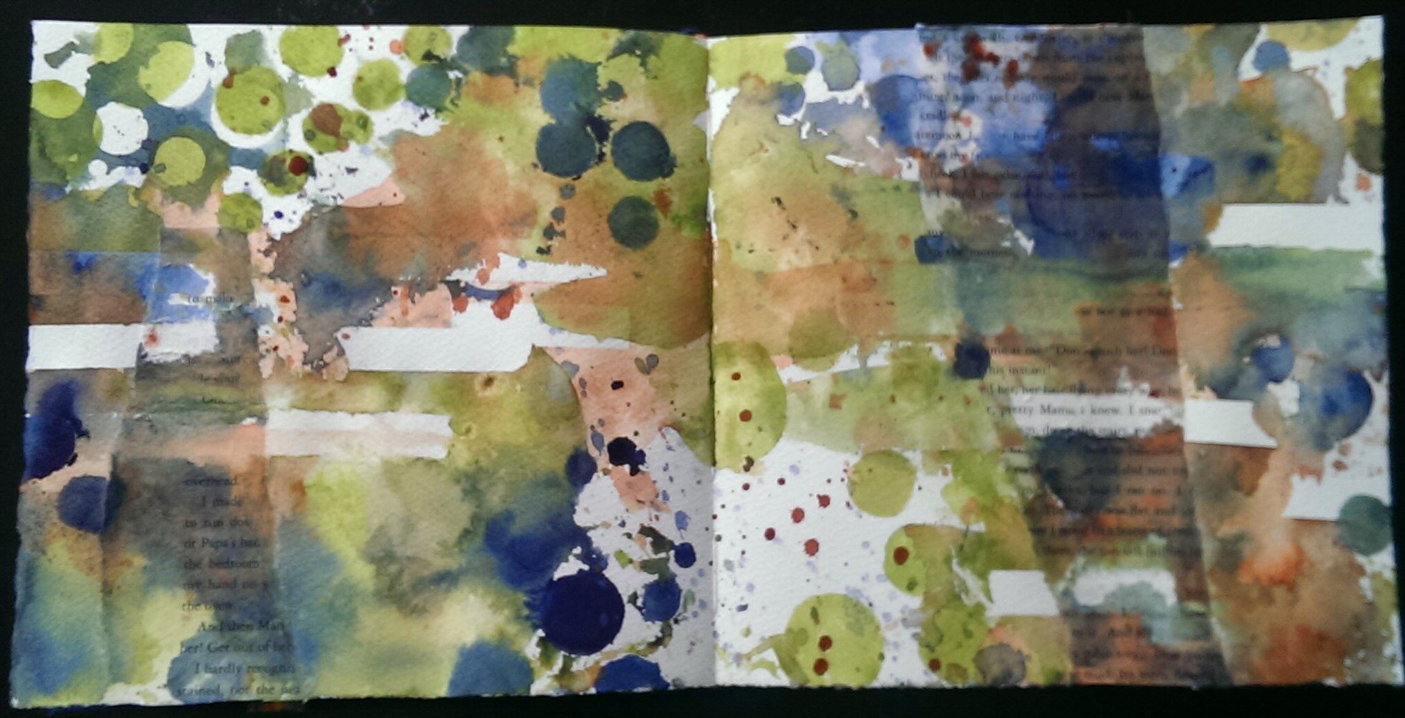 Step six: Additional blue and green added to fill more of the page and balance the composition. Some use of the template, some space filled with wash. Entire page completed while each wash color was mostly wet to get blended effects.