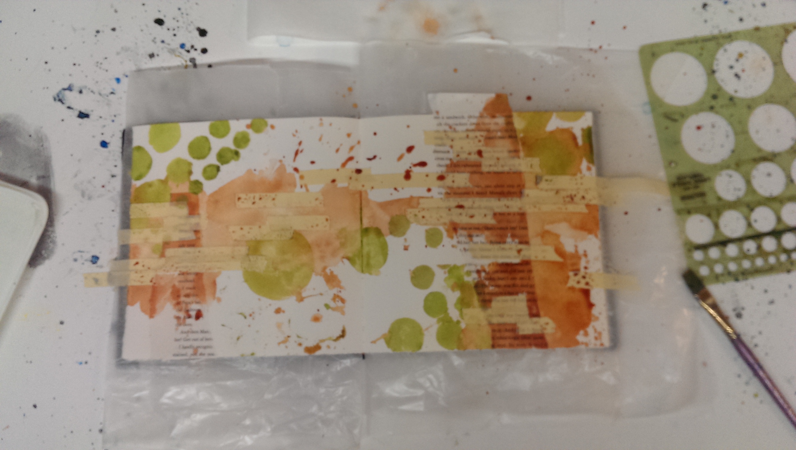 Step four: The addition of some serpentine green while the orange is still wet, using a circle template to push the paint through to the page.