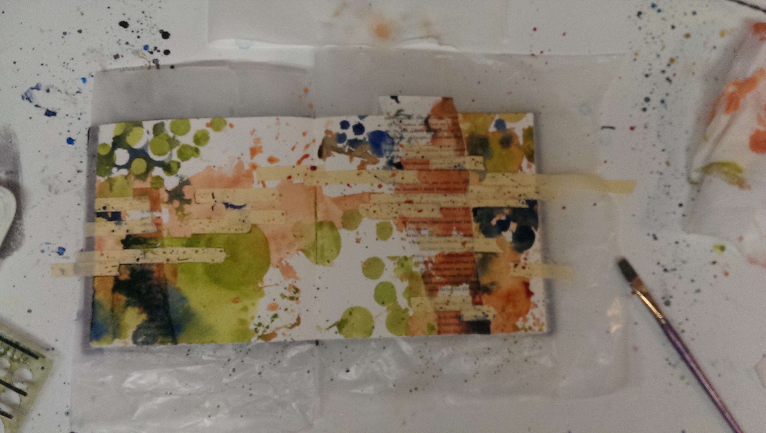 Step two: Using masking tape as a way to preserve some white, with the plan to remove bits as I painted.