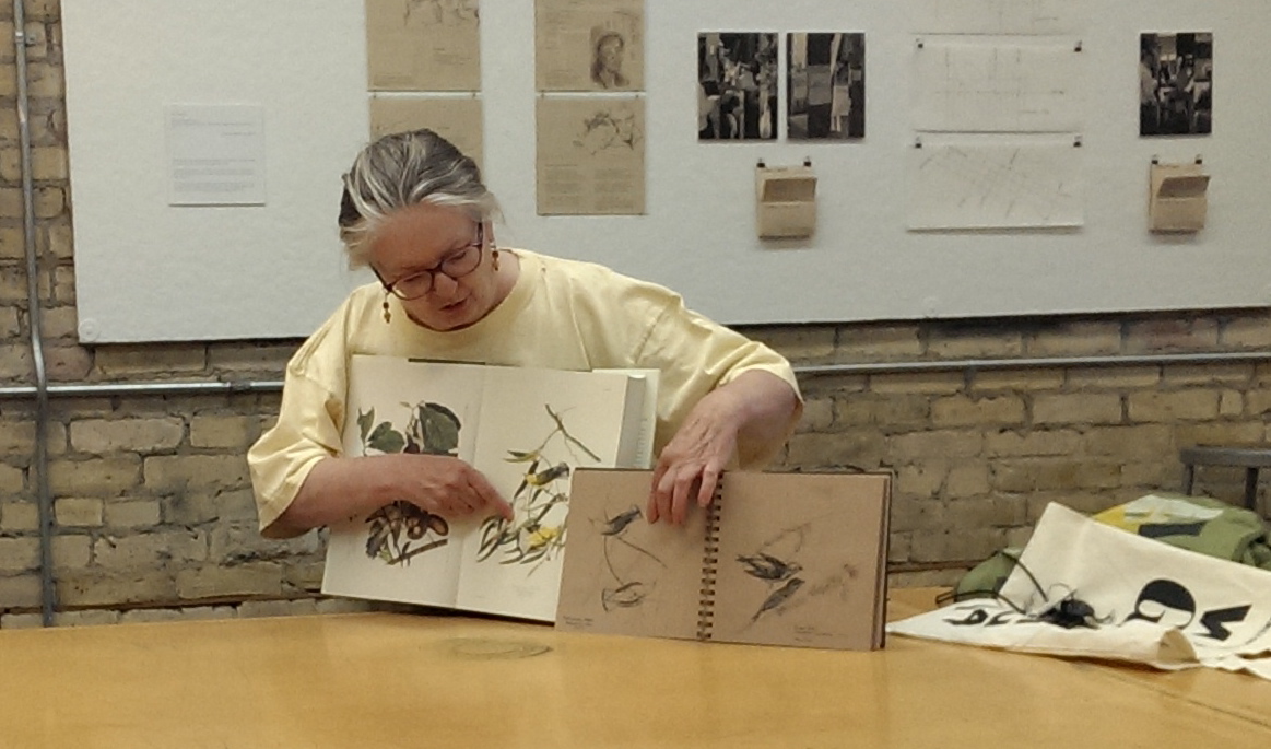 Marsha M brought in John James Audubon’s “Birds of America” along with her wonderful and ongoing journal project to recreate the illustrations of all the Minnesota birds in her Kona paper sketchbook using a limited color palette. Her bird drawings are wonderful and it is interesting to see the project as it progresses each month.